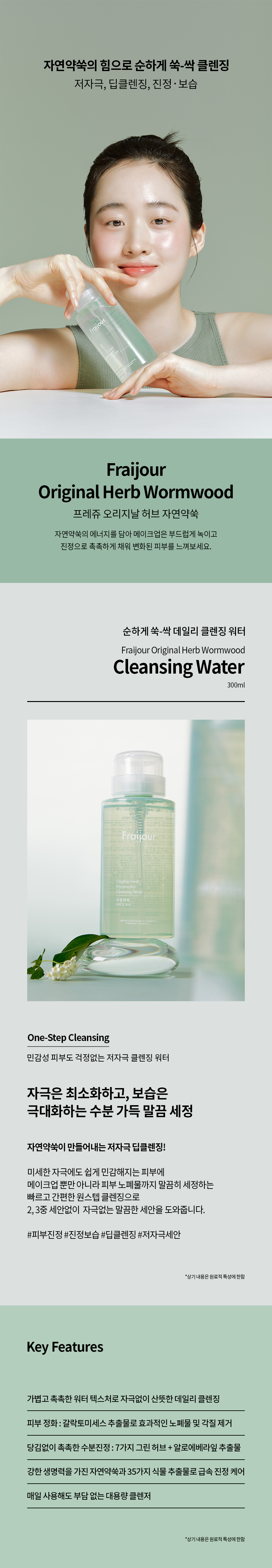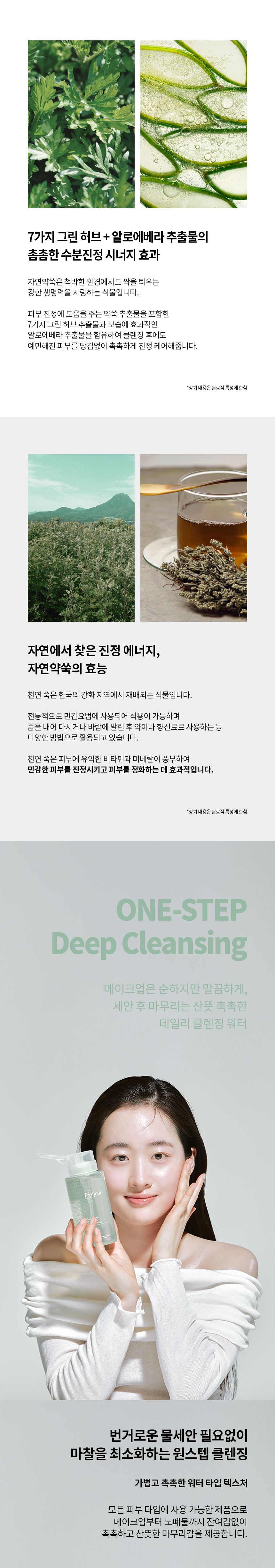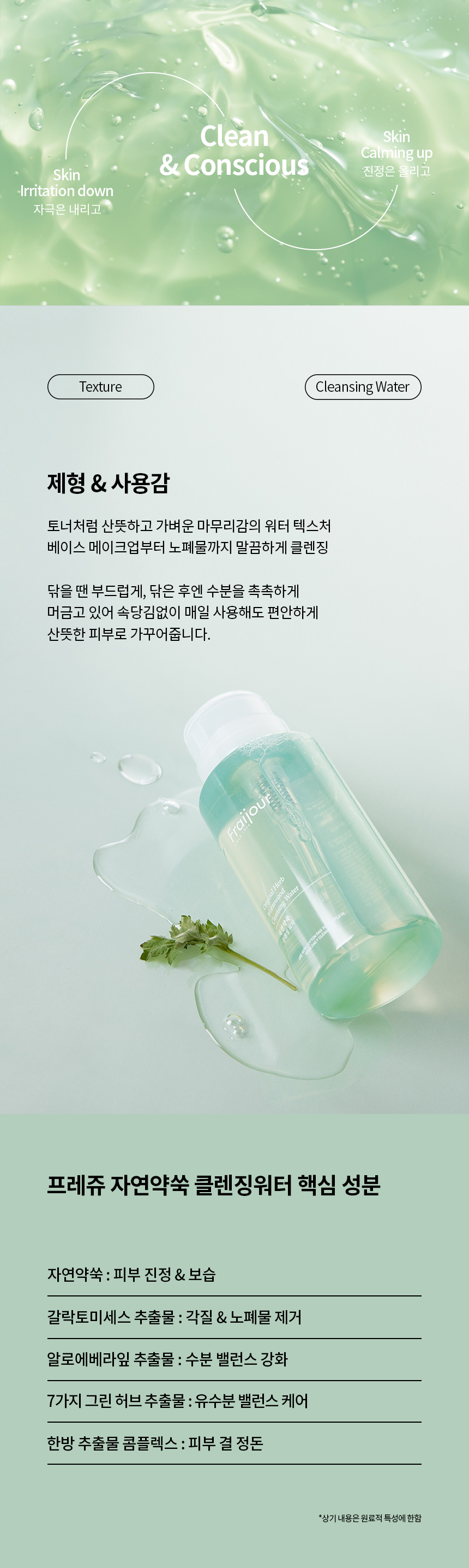 정제수, 메칠글루세스-10, 에톡시디글라이콜, 디프로필렌글라이콜, 부톡시디글라이콜, 글리세레스-26, 디글리세린, 디에톡시디글라이콜, 1,2-헥산디올, 프로판디올, 카프릴릴글라이콜, 애엽(약쑥)추출물, 팔각회향추출물, 브로콜리추출물, 자주개자리추출물, 양배추잎추출물, 밀배아추출물, 서양유채추출물, 무씨추출물, 녹차추출물, 알지닌, 카보머, 라임추출물, 레몬밤잎추출물, 파파야열매추출물, 블랙베리추출물, 블루베리추출물, 라즈베리추출물, 아사이야자추출물, 의이인추출물, 밀추출물, 옥수수커넬추출물, 녹두추출물, 검정콩추출물, 쌀겨추출물, 감초추출물, 감나무잎추출물, 상백피추출물, 백년초열매추출물, 쟈스민꽃/잎추출물, 로즈마리잎추출물, 라벤더꽃/잎/줄기추출물, 위치하젤껍질/잎/잔가지추출물, 유칼립투스잎추출물, 카렌둘라꽃추출물, 페퍼민트잎추출물, 마편초추출물, 캐모마일꽃추출물, 루이보스추출물, 병풀추출물, 갈락토미세스발효여과물, 편백나무잎추출물, 소나무잎추출물, 구주소나무싹추출물, 알로에베라잎추출물