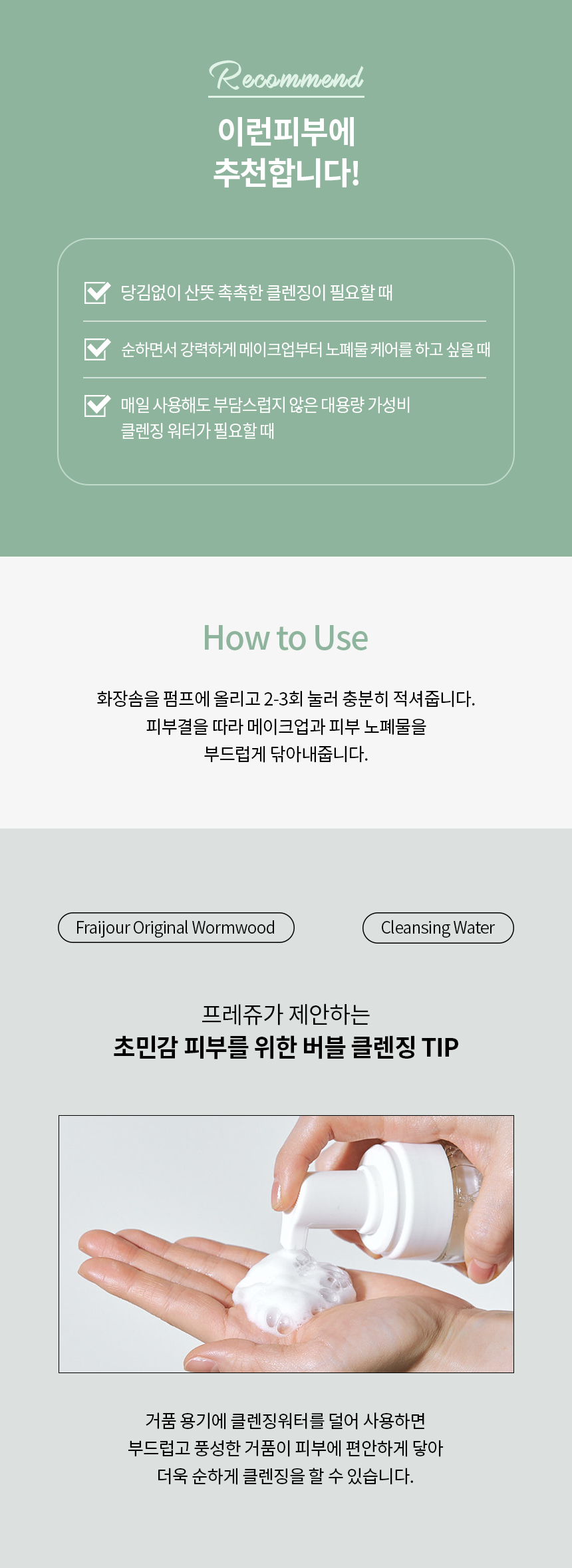 클렌징워터를 화장솜에 적셔 얼굴 또는 전신 등에 이물질을 부드럽게 닦아줍니다.