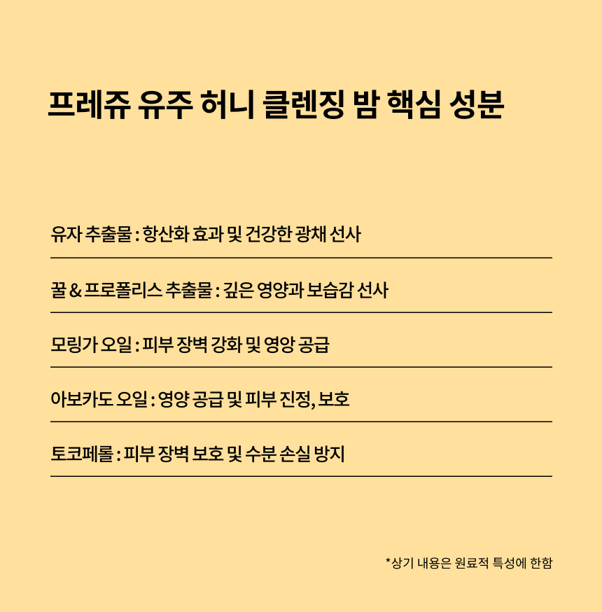 에틸헥실팔미테이트, 세틸에틸헥사노에이트, 피이지-20글리세릴트라이아이소스테아레이트, 폴리에틸렌, 폴리솔베이트20, 정제수, 부틸렌글라이콜, 아나토씨오일, 해바라기씨오일, 돌콩오일, 토코페롤, 토코페릴아세테이트, 유자추출물, 향료, 리모넨, 리날룰, 아보카도오일, 호호바씨오일, 드럼스틱씨오일, 꿀추출물(10mg/100ml), 프로폴리스추출물