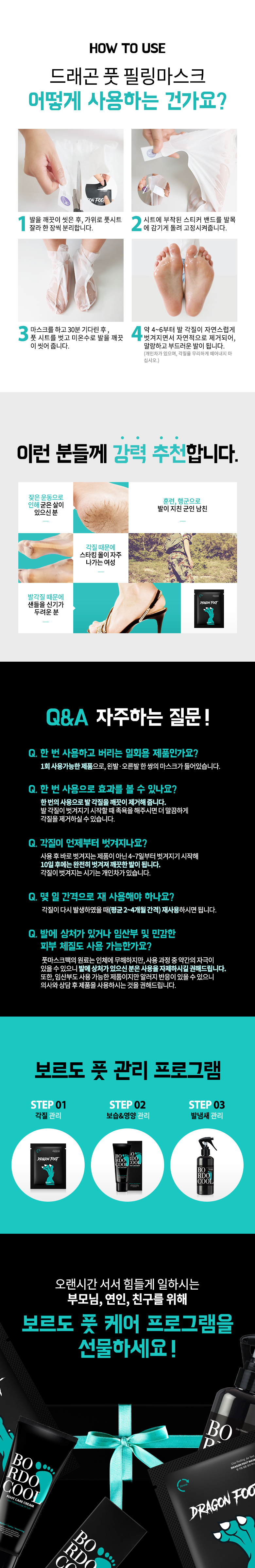 사용방법 1) 발을 깨끗이 씻은후, 가위로 풋 시트를 잘라 한장씩 분리합니다. 2) 시트에 부착 된 스티커 밴드를 발목에 감기게 돌려 고정 시켜줍니다. 3) 30분 후, 풋 시트를 벗고 미온수로 발을 깨끗이 씻어 줍니다. 4) 약 4~6일부터 발 각질이 자연스럽게 벗겨지오니, 무리하게 떼어내지 마십시오. 5) 각질과 굳은 살이 자연적으로 제거되어, 말랑하고 부드러운 발이 됩니다.