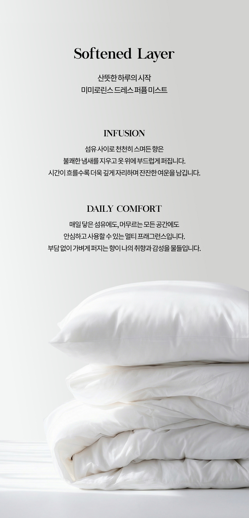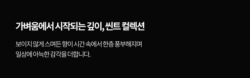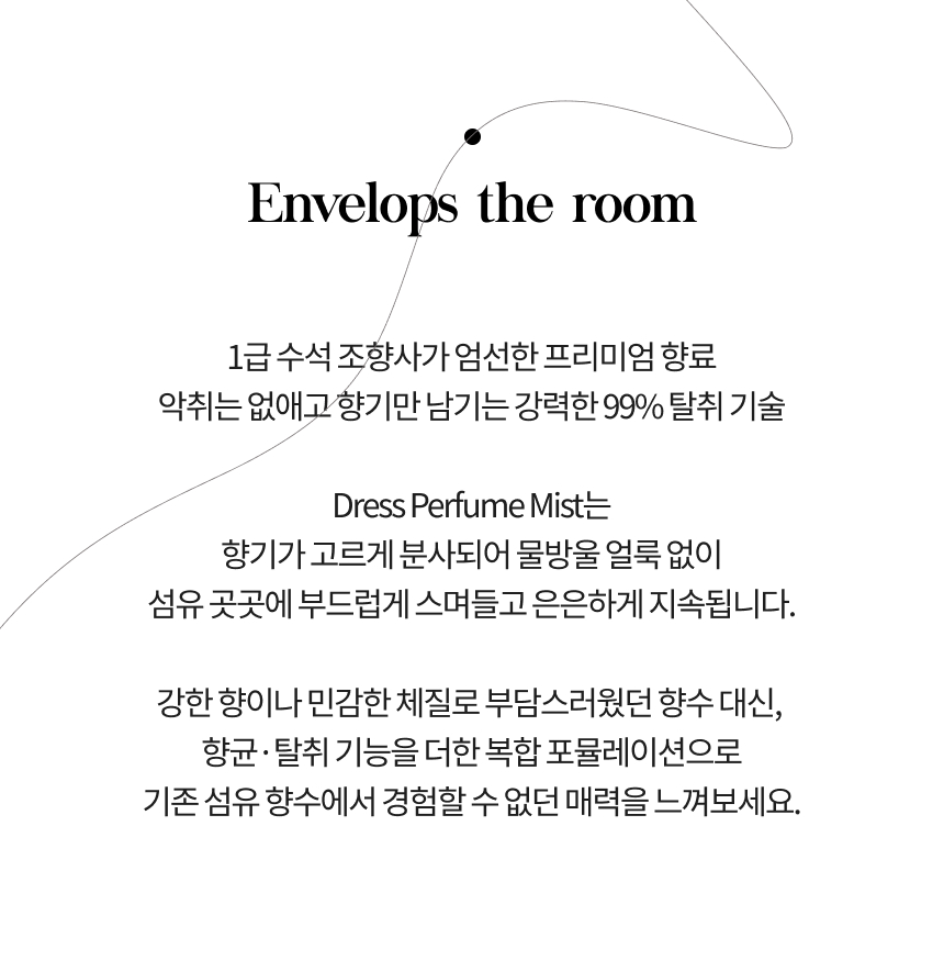 향균 탈취 기능성 복합 포물레이션으로 냄새는 말끔히 제거하고, 은은한 명품의 향취를 남겨드립니다.